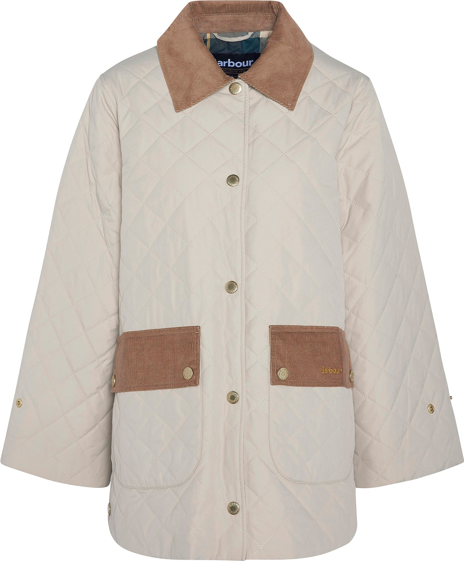Le manteau matelassé Corinne est un manteau matelassé mi-long doté d'un col en velours côtelé classique et d'une fermeture à boutons-pression centrée sur le devant. Il est doté d'ouvertures d'aération latérales hautes à rivets et de poches plaquées avec rabats en corde. Fini avec une doublure partielle en tartan à l'arrière et sous les poignets.