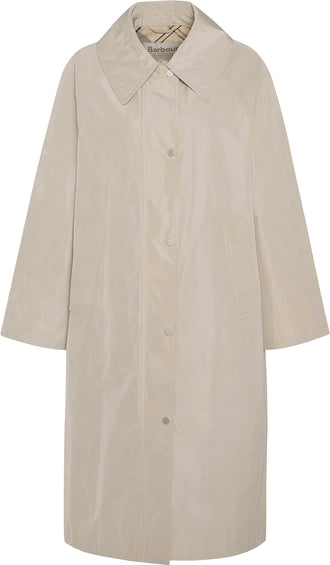 Le manteau résistant à la pluie Sonnet présente une coupe caban classique rehaussée d’une fermeture à boutons sur le devant et d’une ouverture d’aération au dos.