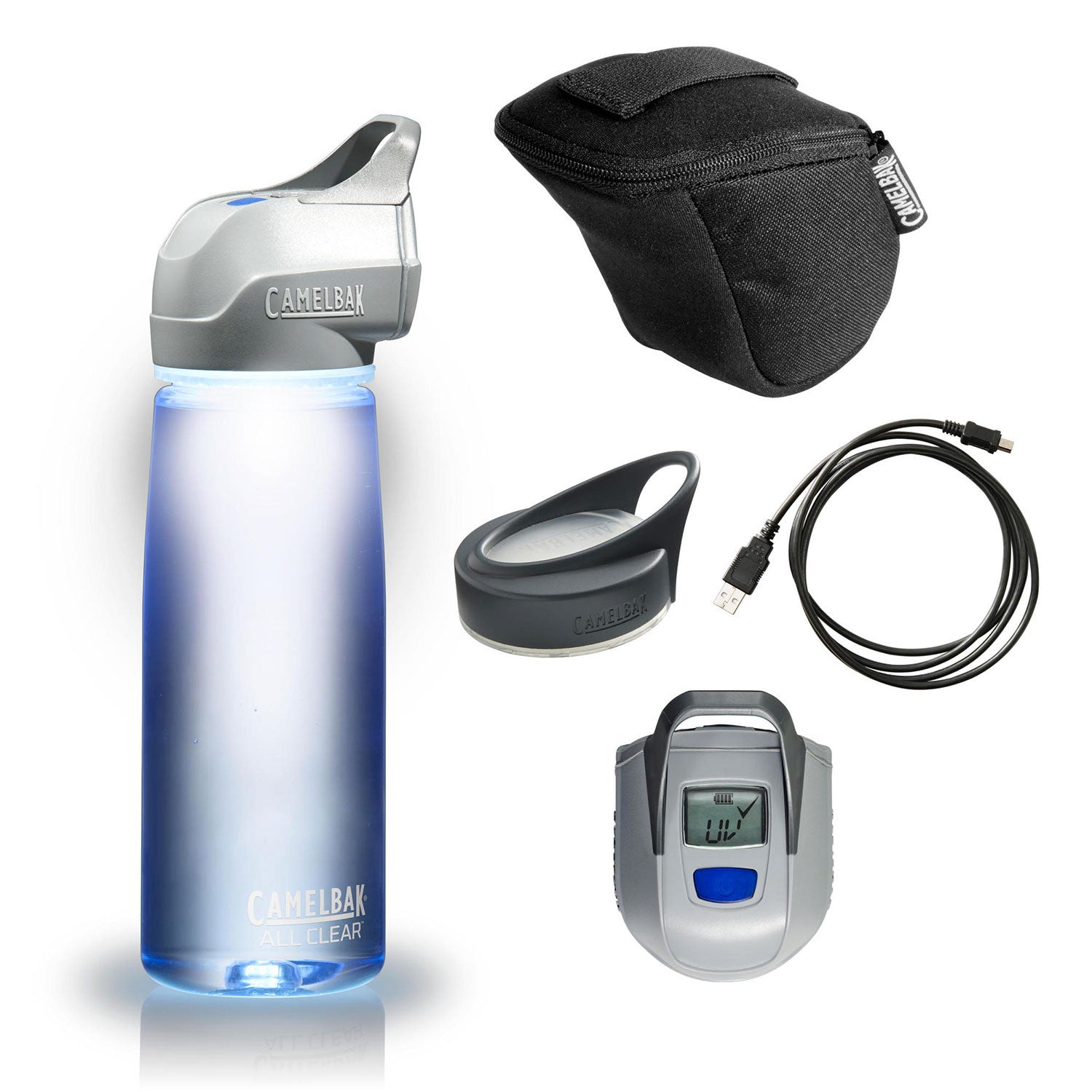 Comprend : couvercle UV, bouteille de 0.75l, câble USB pour recharge, étui de protection, bouchon classique