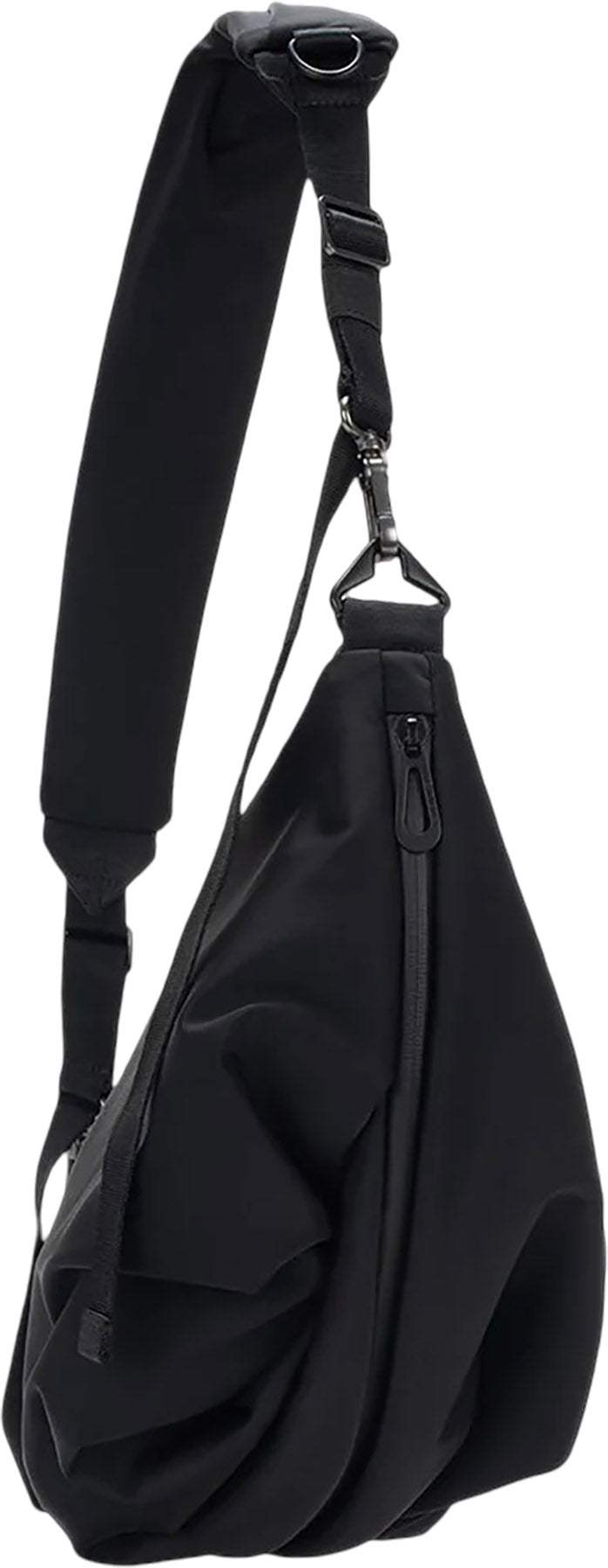 Le sac à bandoulière Orne est fabriqué à partir de tissu onyx de haute qualité, offrant une sensation de douceur au toucher tout en conservant une forme structurelle. Le tissu est tordu à la base pour donner un effet de mouvement, formant des plis élégants qui ajoutent de la texture au sac. Fini avec une quincaillerie gris acier mat et une bandoulière Adda à glissière qui peut également être portée séparément.