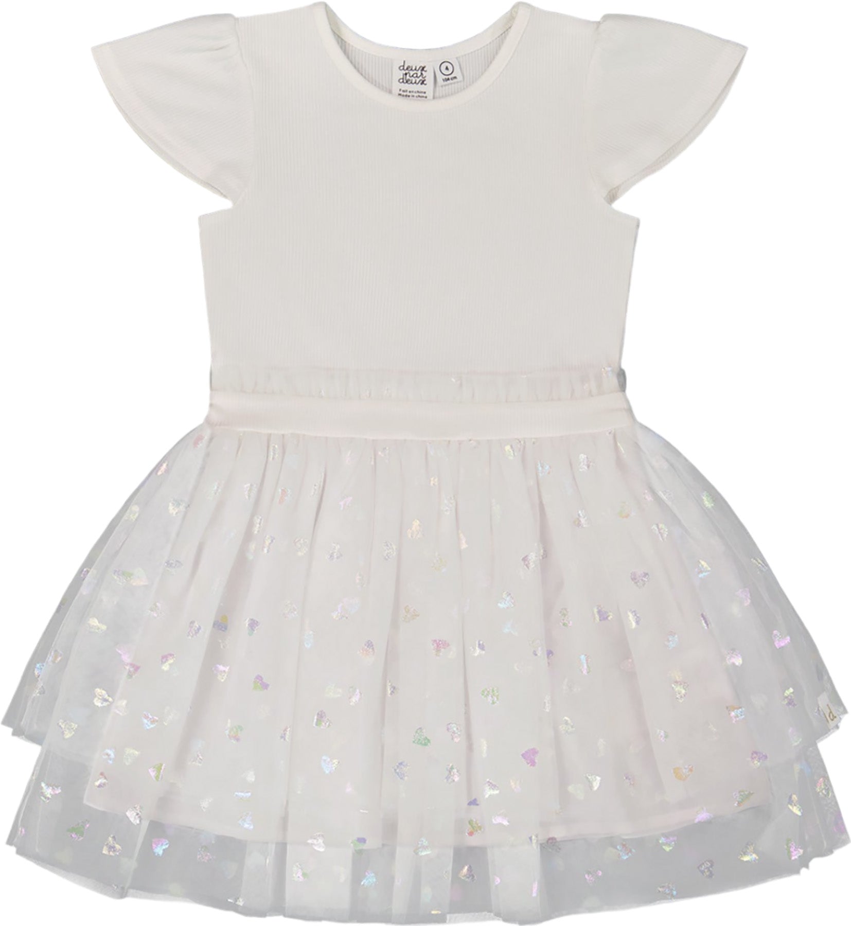 Notre robe bi-matière avec jupe à cœurs pailletés blanc neige est faite pour des occasions spéciales nécessitant un look mémorable! Riche en textures, cette robe a un corsage à manches papillon avec un col rond, une taille froncée, et une jupe évasée en forme de A. Une superposition d'organza transparente avec un imprimé de cœurs pailletés la rend parfaite pour la petite fille qui aime briller de mille feux!