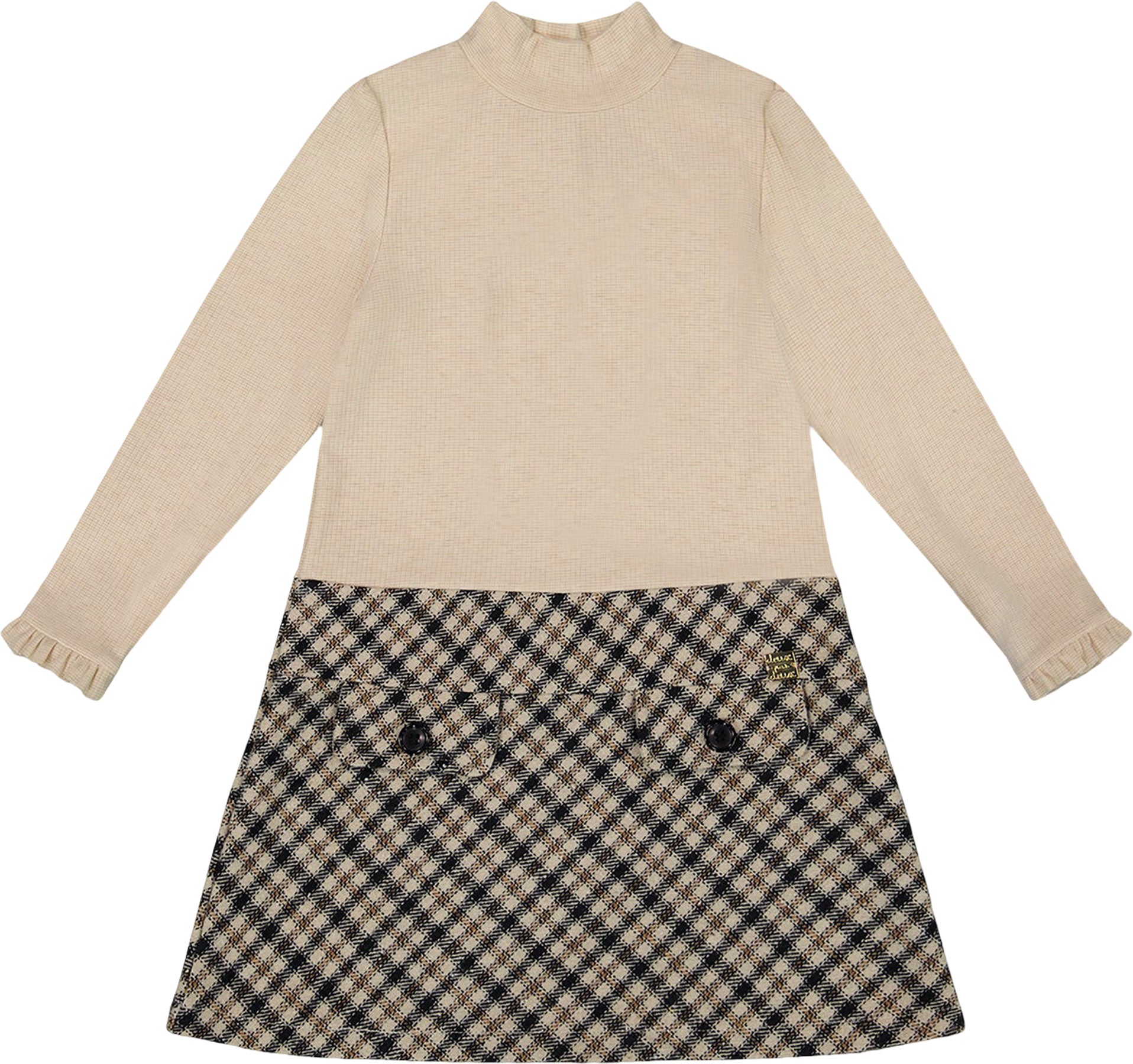 De petits volants aux poignets apportent une touche féminine irrésistible à cette robe bicolore facile à porter. Avec son haut en tricot côtelé à manches longues et col montant, et sa jupe droite à taille basse en biais à carreaux, cette robe combine confort et style. Des poches à rabat avec boutons décoratifs viennent parfaire le tout. À porter avec des bottines ou des souliers pour varier les looks à l’infini!