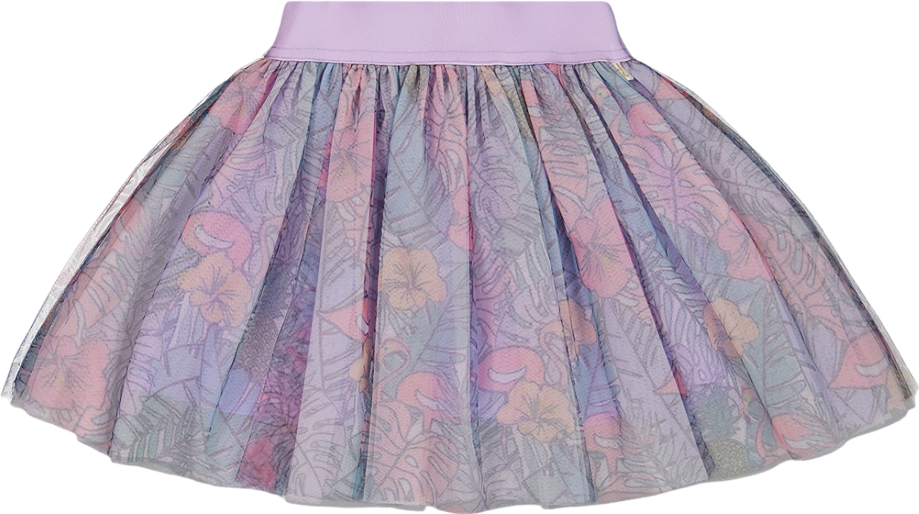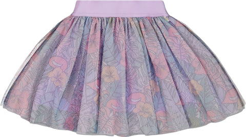 Notre jupe en tulle imprimé tropique lilas et flamants roses est un must-have pour la petite fille qui adore virevolter! Cette jupe adorable a une silhouette évasée en forme de A avec une ceinture élastique extensible, une superposition de tulle et un imprimé coloré.