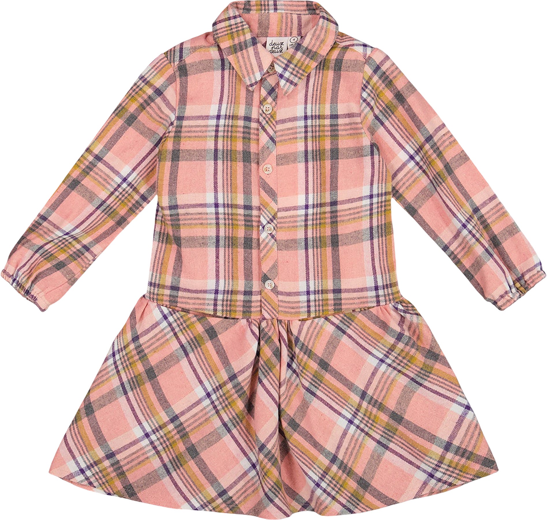 Notre robe chemisier à carreaux avec volant rose, jaune et gris allie élégance classique et allure décontractée. Confectionnée en flanelle 100% coton toute douce, cette robe a un col chemise, une fermeture boutonnée, des manches longues à poignets élastiqués et un volant en bas. Une robe idéale pour les jeunes filles au style doux et structuré.