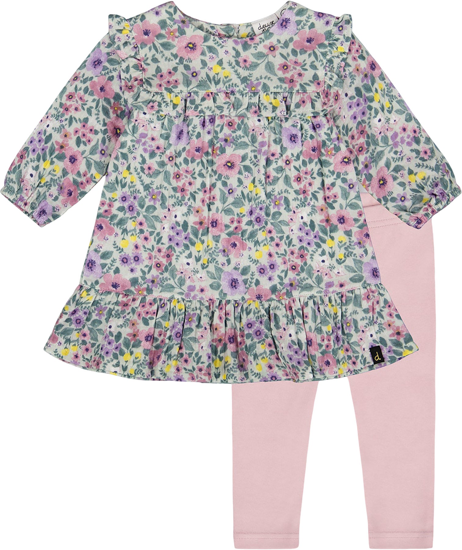 Une pièce pleine de charme issue de notre collection Contes d’hiver, notre ensemble robe en mousseline imprimée sauge fleuris et legging uni allie confort et élégance en toute occasion. La robe tunique, en mousseline douce, arbore un délicat imprimé floral, des manches longues, des détails volantés et une silhouette fluide. Accompagné d’un legging mauve neutre en interlock ultra-confortable, cet ensemble est idéal pour les petites aventures du quotidien.