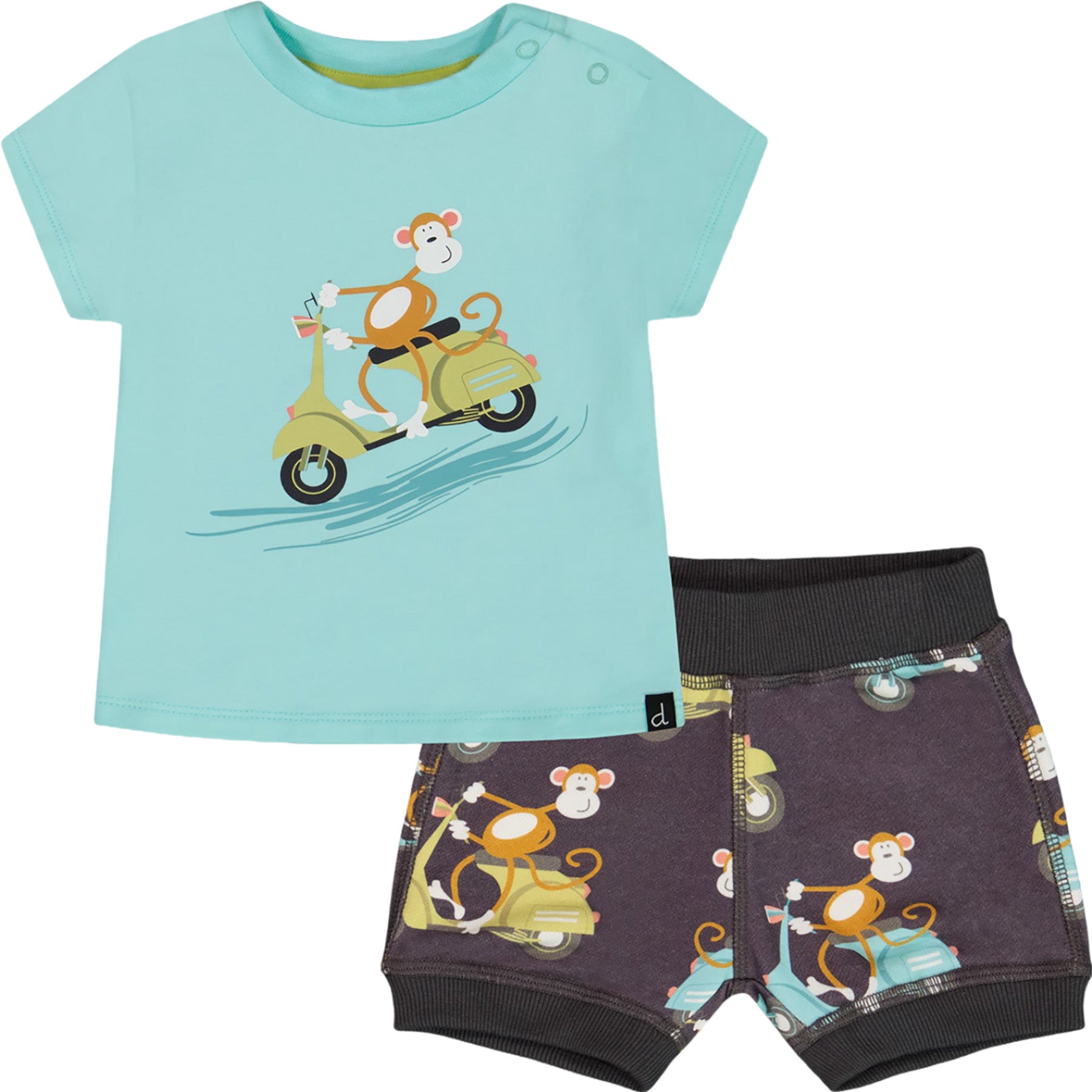 Un singe sur une Vespa ajoute un esprit ludique à notre ensemble deux pièces haut et short avec singe sur vespa bleu marine et turquoise. Cet adorable ensemble se compose d'un t-shirt à manches courtes avec un col rond, des épaules à boutons-pression et un imprimé graphique attrayant sur la poitrine. Nous l'avons associé à un short confortable doté d'une ceinture élastique extensible et d'un imprimé multicolore de singes en Vespa.