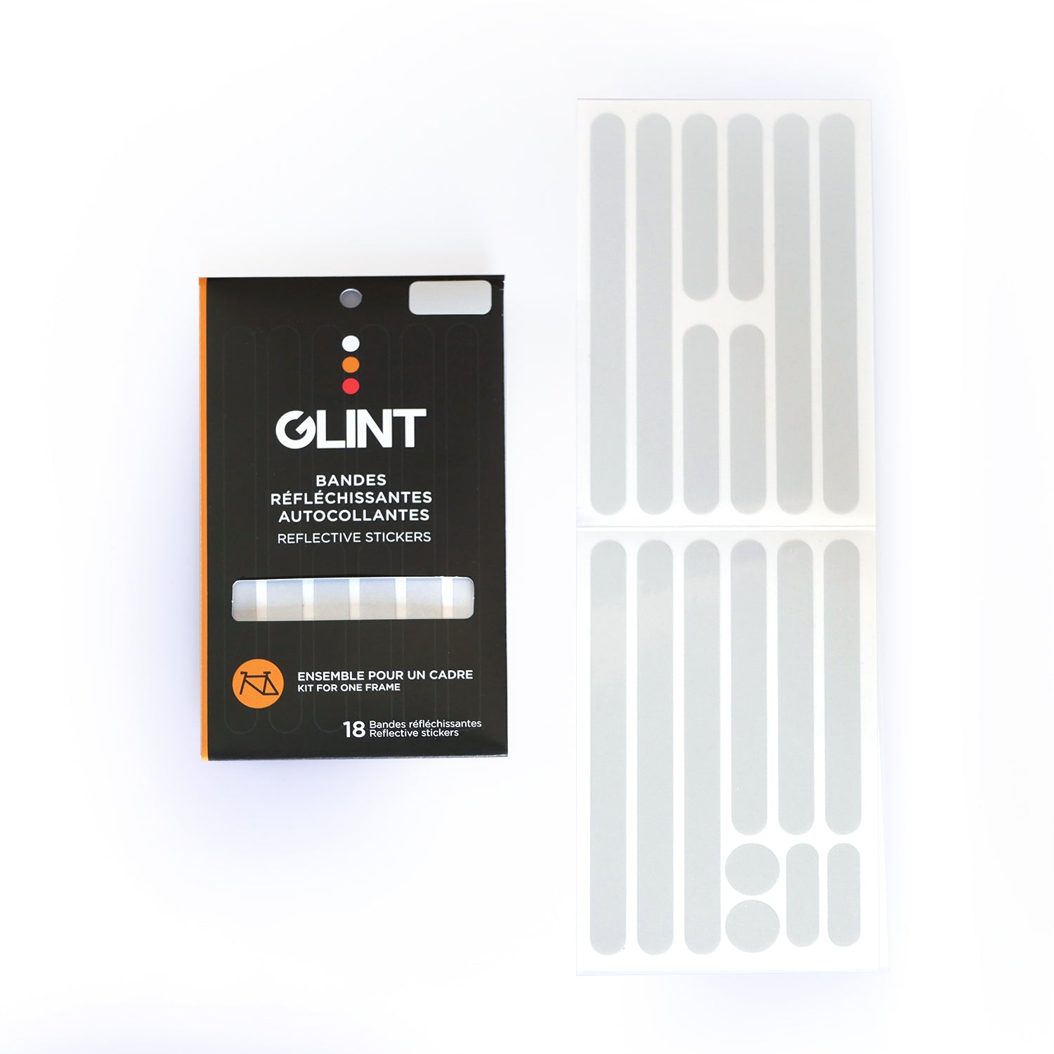 Cet ensemble réfléchissant GLINT offre un assortiment de 36 autocollants de haute qualité spécialement conçus pour être appliqués sur chaque partie du cadre de votre vélo. L’ensemble tricolore utilise du blanc (avant), jaune (milieu) et rouge (arrière) afin de vous assurer une visibilité maximale et une conformité au code de la sécurité routière.