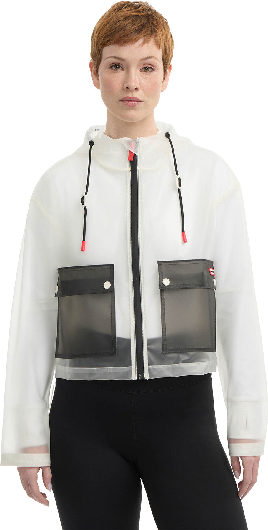 Découvrez le mélange ultime de style et de fonctionnalité avec la veste courte transparente mate Jessie. Avec son contraste de couleur, son capuchon fixe, ses poches appliquées contrastées et ses accents rouges Hunter, il rehaussera n’importe quel look.