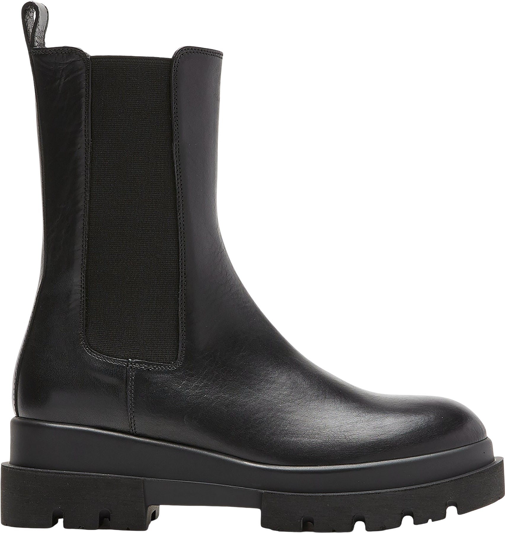 Botte Chelsea classique en cuir, dotée d'une semelle compensée, d'un bout rond, de bandes élastiques sur les deux côtés et d'une languette décorative.
