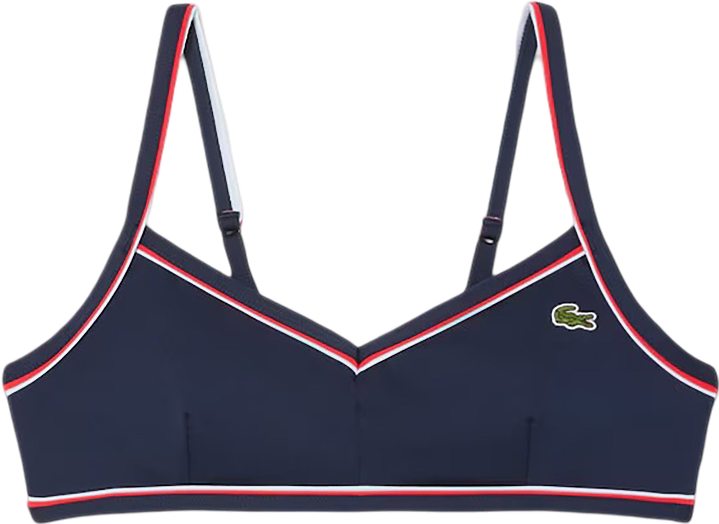 Lacoste apporte une touche d’élégance à un indispensable de la saison estivale avec ce haut de maillot de bain. Avec son décolleté en V, ses fines bretelles ajustables et ses liserés contrastants, il offre une silhouette féminine. Ses coques sont amovibles pour plus de confort.