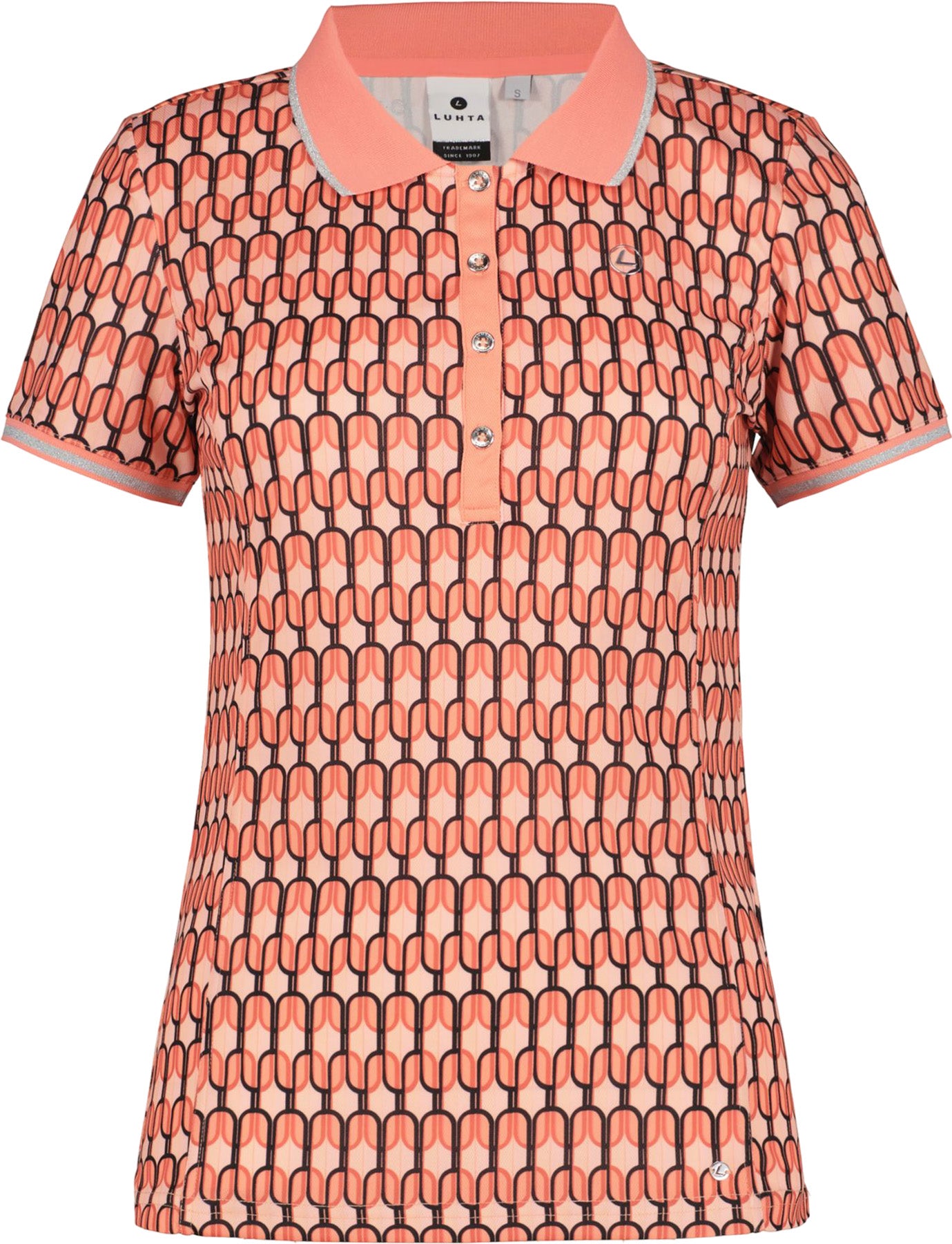 Polo Luhta pour femme. Poignets élastiques côtelés. Demi-bouton sur le devant. Motif imprimé. Étiquette avec logo. La fonctionnalité et le confort ont fait l'objet d'une attention particulière lors de la conception de ce produit A.W.S. Active, ce qui le rend adapté aux activités énergiques et décontractées. Ce produit contient des matériaux recyclés, ce qui réduit l'impact sur l'environnement.