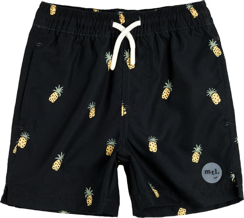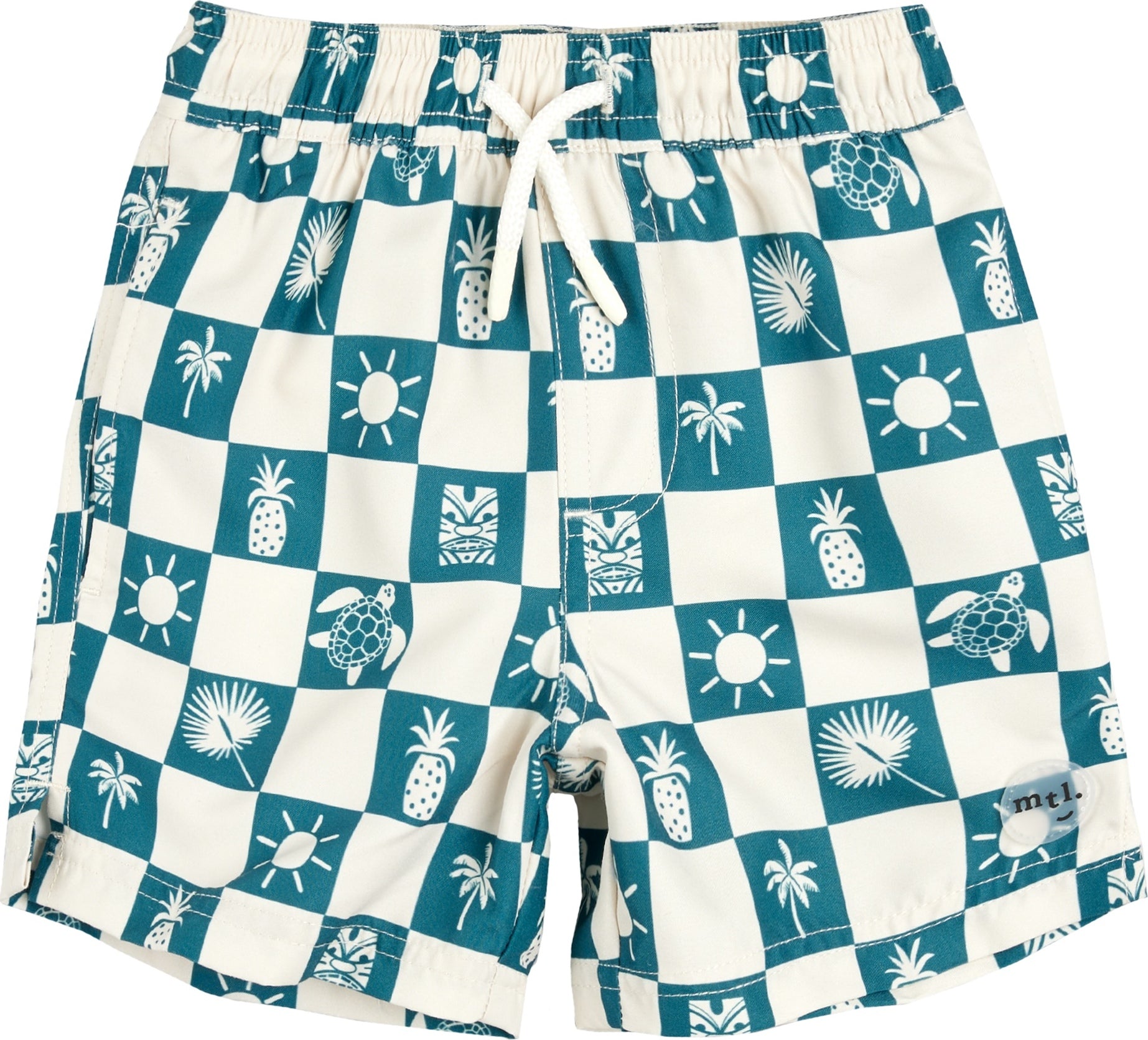 Ce short de bain cool et excentrique est parfait pour votre petit surfeur qui s'éclabousse dans les vagues. Avec son imprimé en damier, parsemé de petites icônes de vacances comme des ananas, des palmiers et des rayons de soleil, ce maillot sera un véritable succès pour l'été. Fabriqué en polyester recyclé, le short de bain est léger et respirant et intègre une protection solaire UPF50+. Il existe une barboteuse de bain assortie pour le petit frère et des protège-tibias coordonnés pour les personnes à la peau délicate.