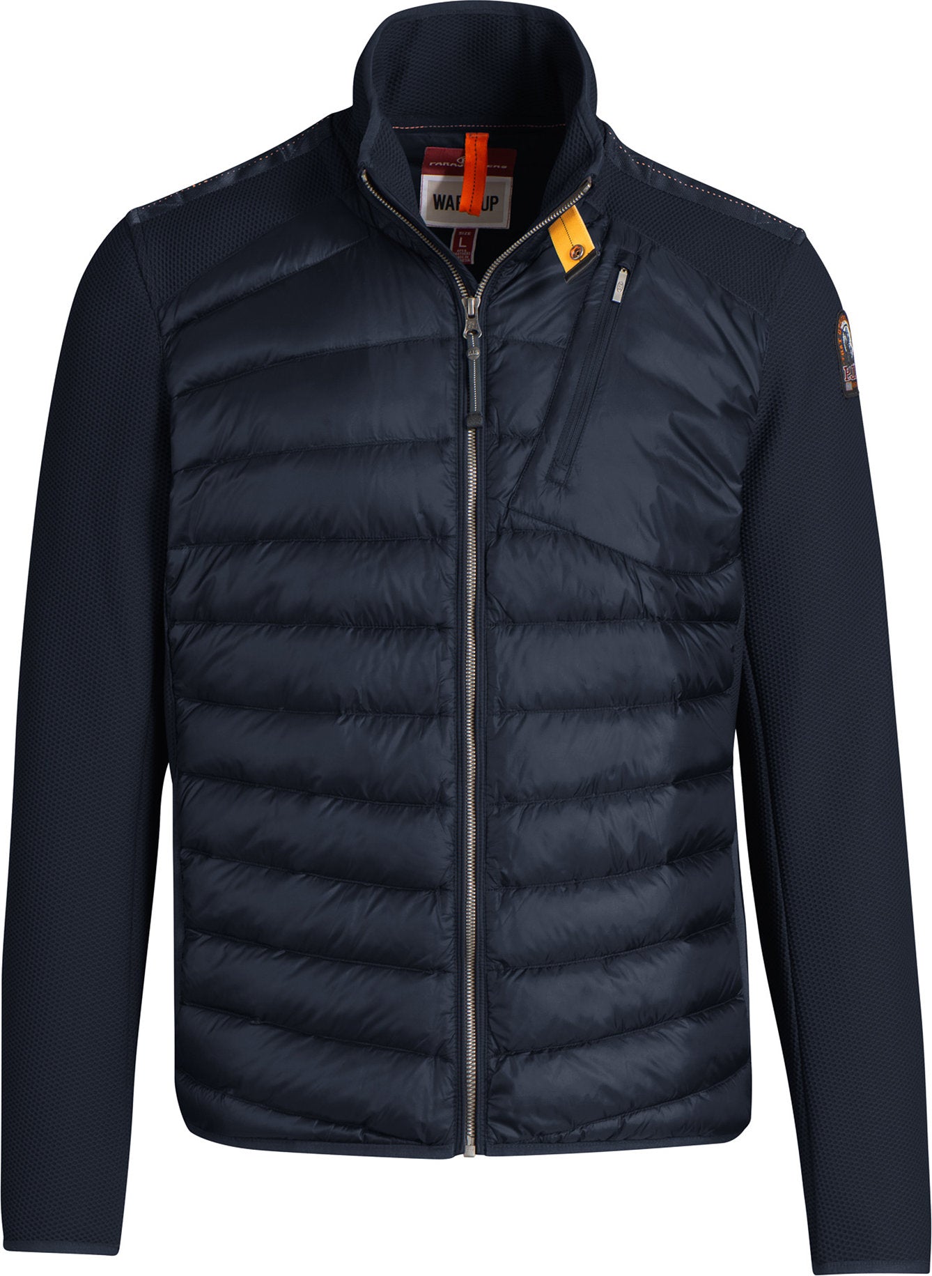 Veste en polyester avec un point nid d'abeille et un intérieur en polaire doux avec des applications en nylon 20 deniers rembourrées en duvet. Trois poches devant, une petite poche zippée dans le dos et deux poches internes. Bordures en lycra. Ouvertures d'aération au niveau des aisselles. Écusson PJS sur la manche gauche et col fermé par un ruban élastique.