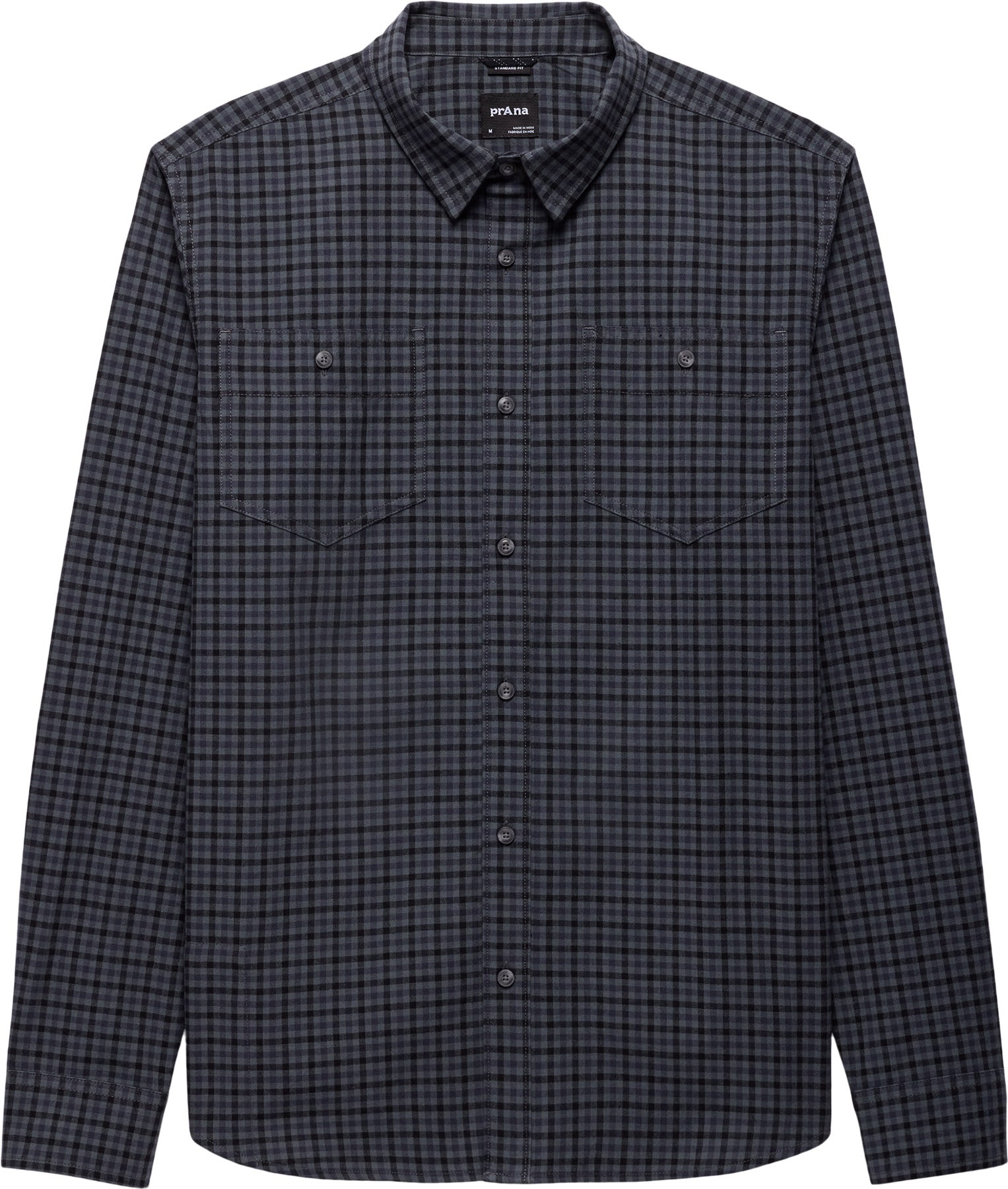 Ses éléments de conception incluent deux poches plaquées boutonnées, un empiècement intérieur doublé, un logo prAna brodé à la patte de boutonnage au poignet droite et des boutons en émail ébréché. Elle est offerte avec une coupe ajustée, régulière et grande taille.