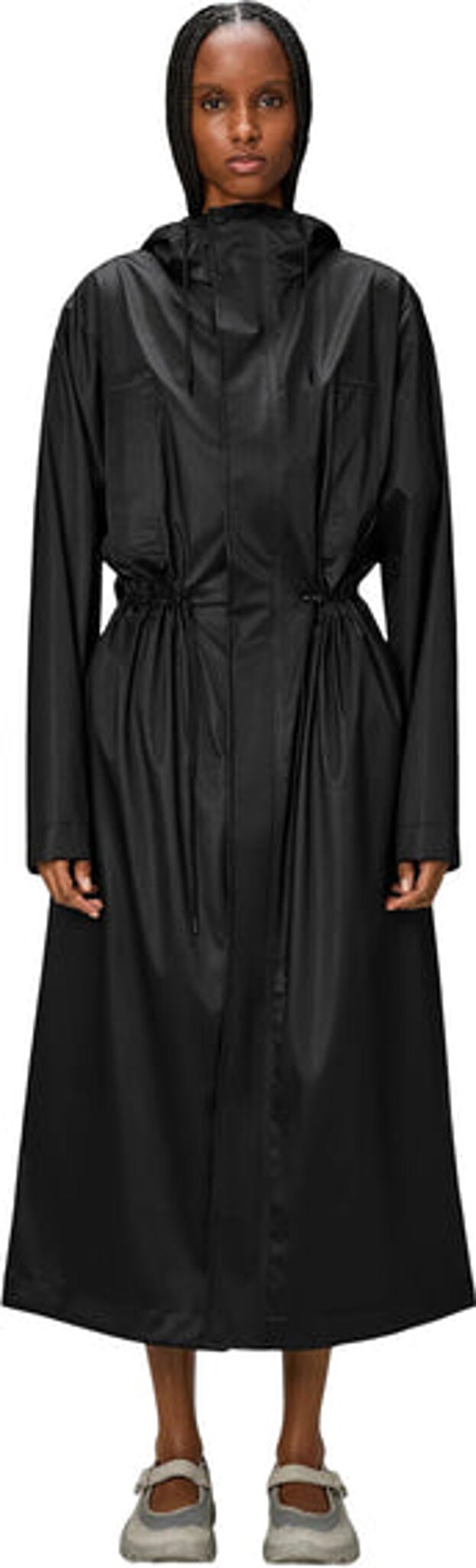 Bold Longest Jacket est une veste de pluie unisexe à la coupe plus longue et plus exagérée. Le design élégant à la silhouette audacieuse est particulièrement fonctionnel. Boldest Longest Jacket joue audacieusement avec les détails. Capuche avec cordon de serrage, fermeture à glissière sous un rabat-tempête avec boutons-pression invisibles et fermeture à bouton-pression aux poignets. Le dos présente un empiècement exagéré avec une doublure en maille pour un confort respirant. La veste maxi est complétée par un cordon d'ajustement à la taille ainsi que par deux larges poches passepoilées pour transporter et conserver vos essentiels au sec lors de vos déplacements en ville. Ce modèle est confectionné dans le tissu PU emblématique de Rains et présente des coutures soudées. La finition est légère et lisse au toucher.