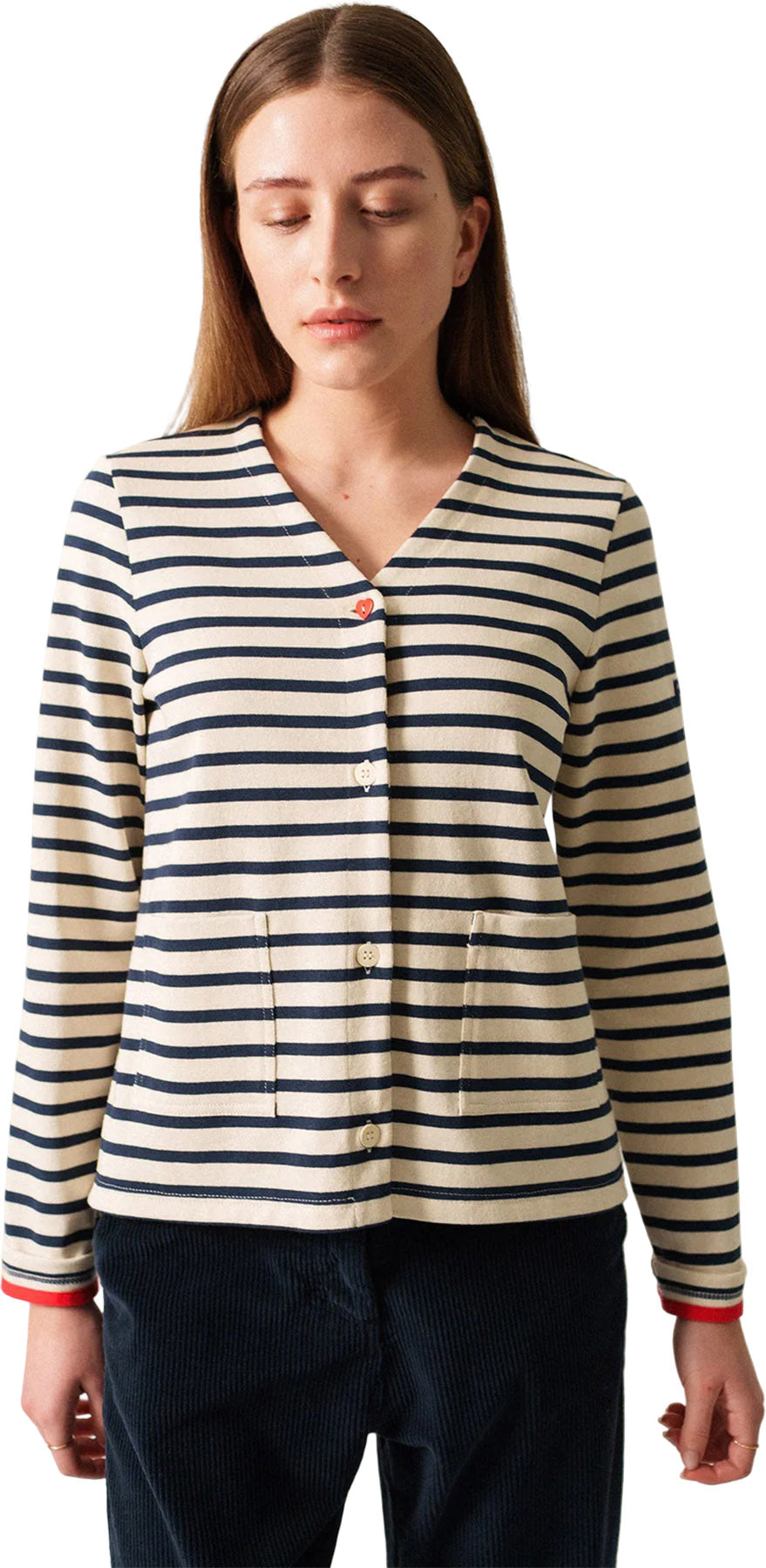 Une fusion parfaite entre le style classique de la marinière Méridame et le style d'un cardigan. Faisant partie de la capsule Amour, ce modèle se distingue par ses deux poches extérieures et un bouton en forme de cœur, ajoutant une touche d'amour à votre garde-robe, le tout confectionné en jersey lourd en coton dans nos ateliers à Saint-James.