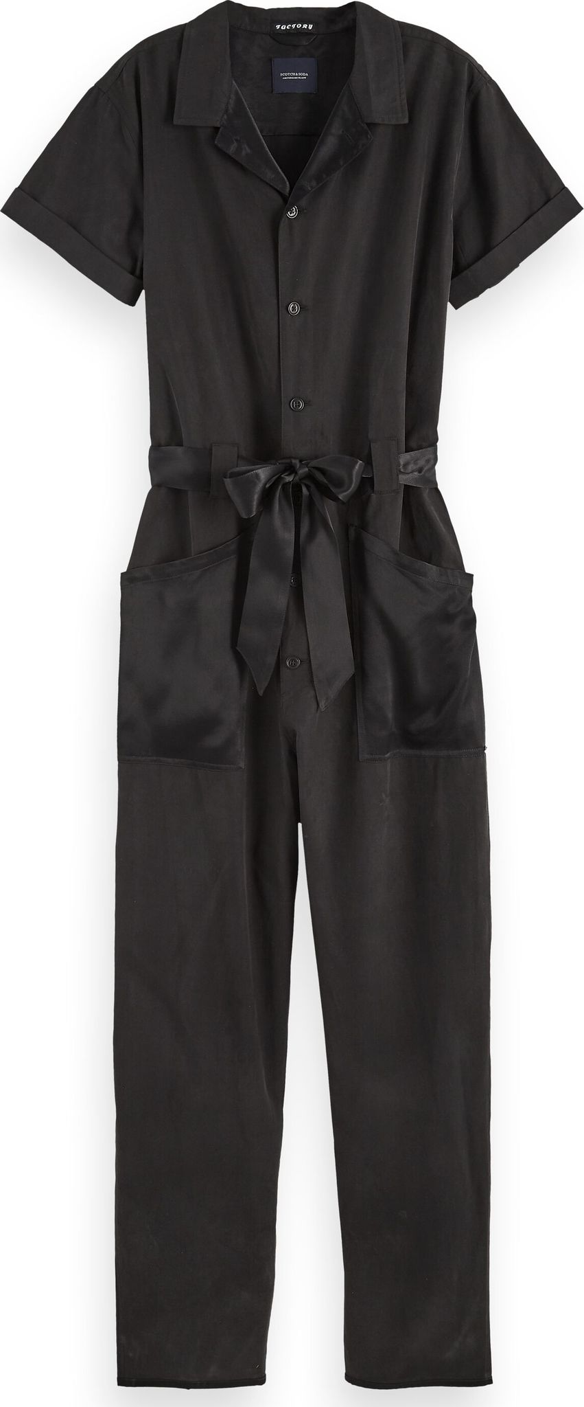 Cette combinaison d’inspiration utilitaire est confectionnée en mélange de coton et de lyocell et possède des détails en satin aux poches et au col pour un mélange de textures. Elle dispose d’un col hawaïen, d’une fermeture boutonnée, de manches à revers et d’une ceinture à nouer en satin.