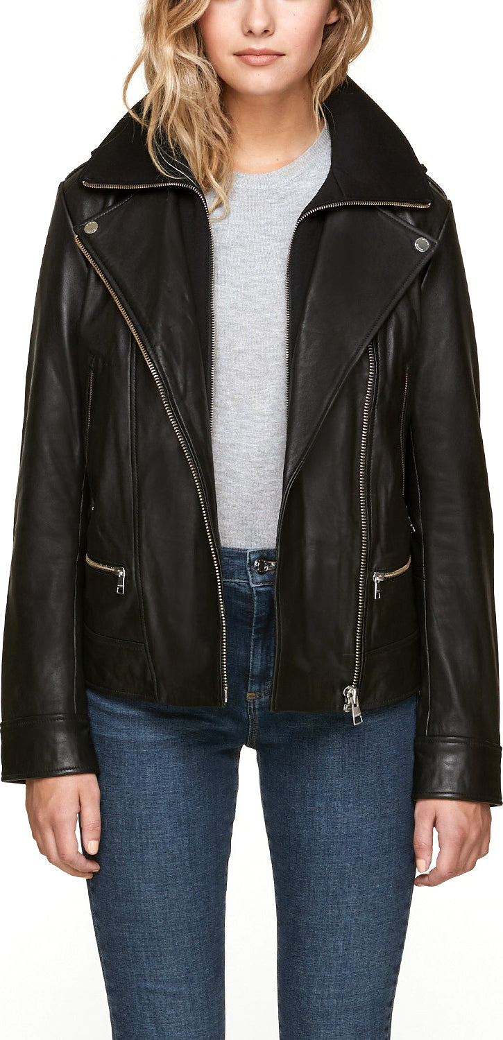 Brandy est une classique veste en cuir avec col moto contemporain et coupe droite. Rehaussez toutes vos tenues de mi-saison grâce à la fermeture éclair asymétrique. Comporte un plastron en tricot amovible pour une polyvalence multi-saisons inégalée. Doublure extensible pour encore plus de mouvement.