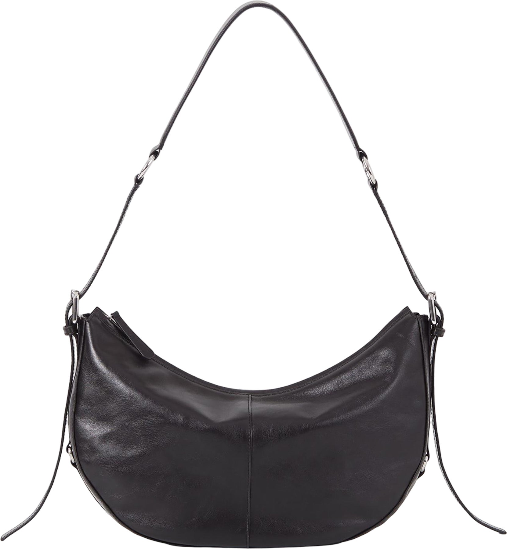 Itami est le petit sac demi-lune à silhouette décontractée. Confectionné à partir de cuir noir, ce style présente une bandoulière réglable, des garnitures en métal et une petite poche intérieure. Le sac est complété par une fermeture éclair.